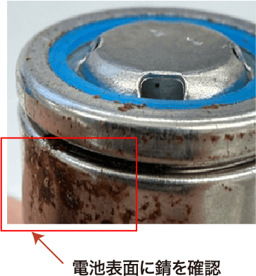 - ③電池表面に錆があり、電池の管理に対しての懸念や異物混入の恐れがあります。