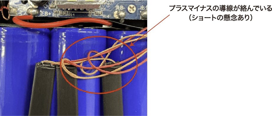 - ④3本の導線について、プラスとマイナスの線が絡んで組み込みがされており、導線の被覆が傷ついた場合、短絡する可能性があります。