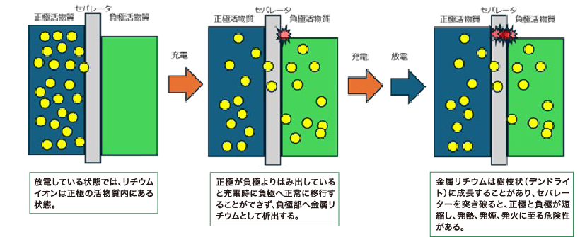 - リチウムイオン電池が膨張・発熱するのは、内部のセパレーターが損傷して正極と負極が短絡し、電解液の分解反応が進行するためです。